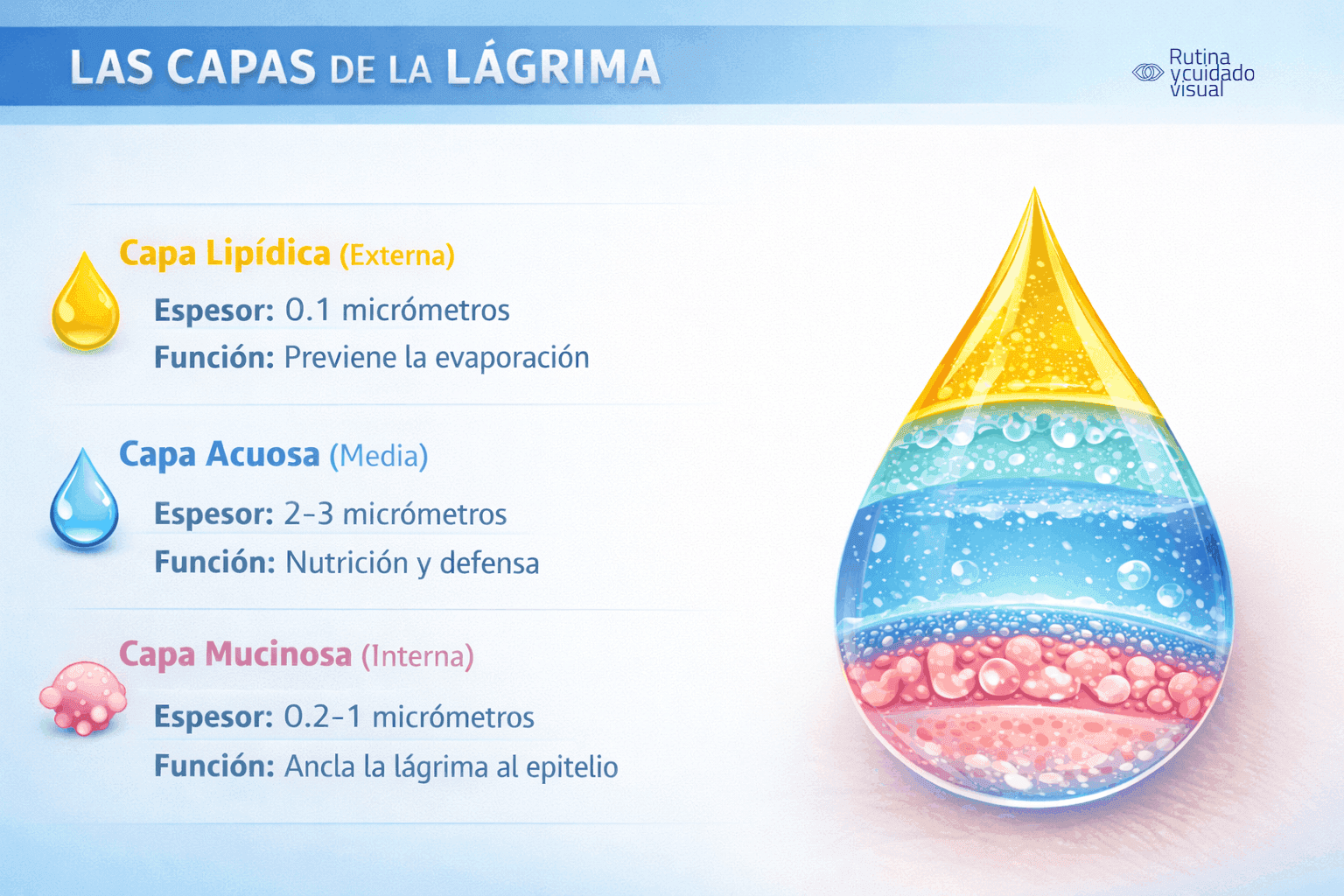 Para entender por qué desarrollamos ojo seco, primero debemos comprender la complejidad de la película lagrimal normal. No es simplemente "agua salada" como muchos creen, sino una estructura sofisticada de tres capas interconectadas: